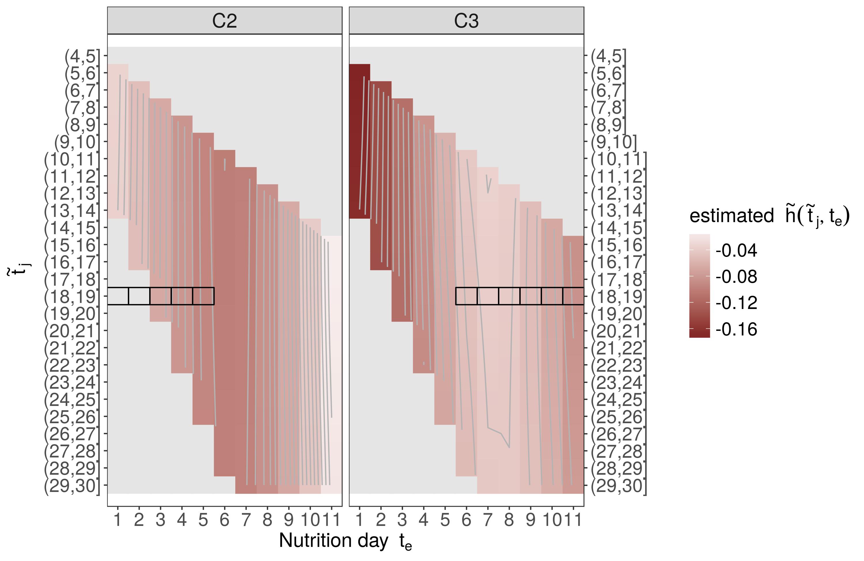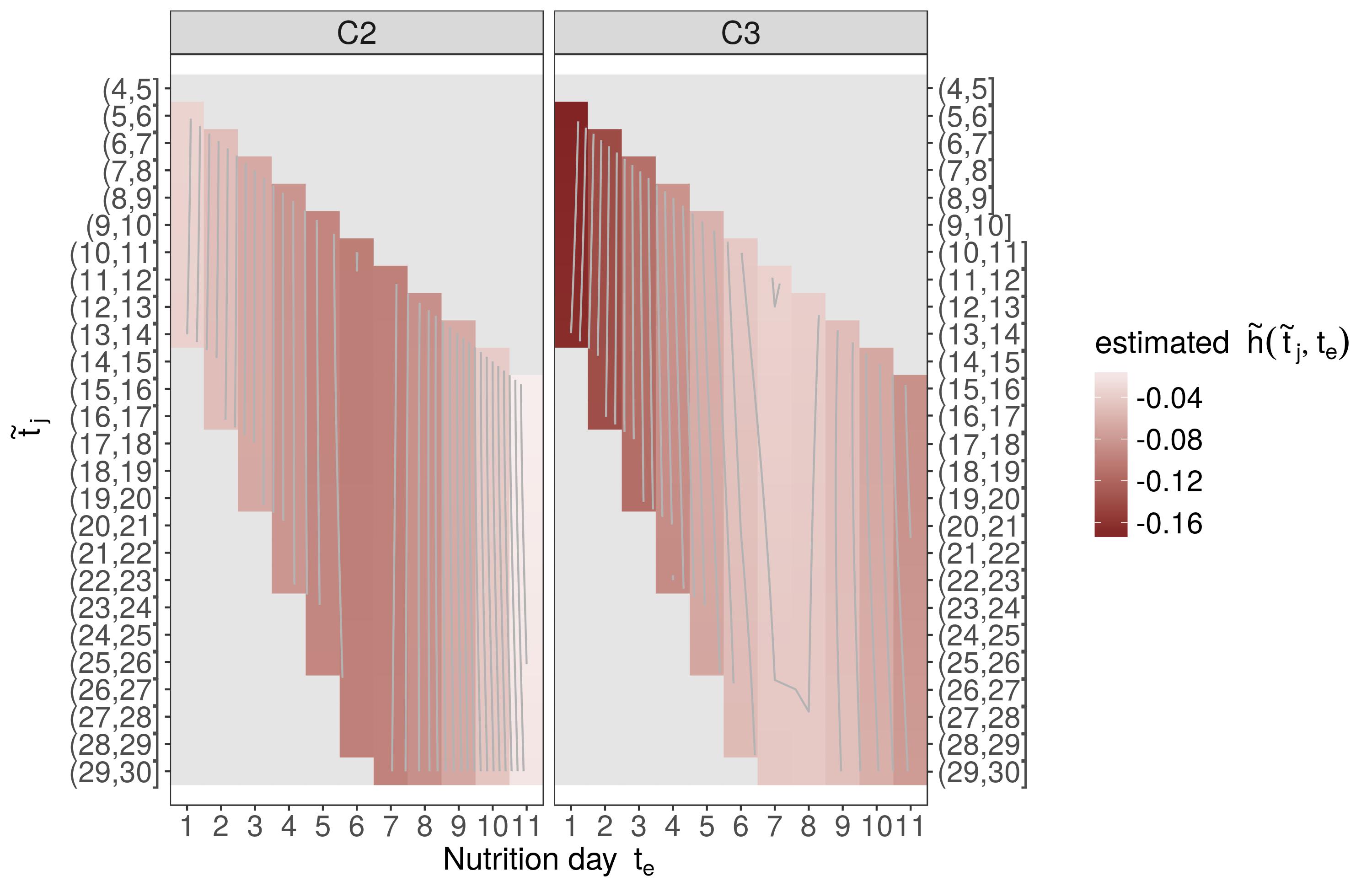 effect of nutrition might "wear off" after some time (e.g. nutrition on day 1 likely won't affect the hazard on day 30)
